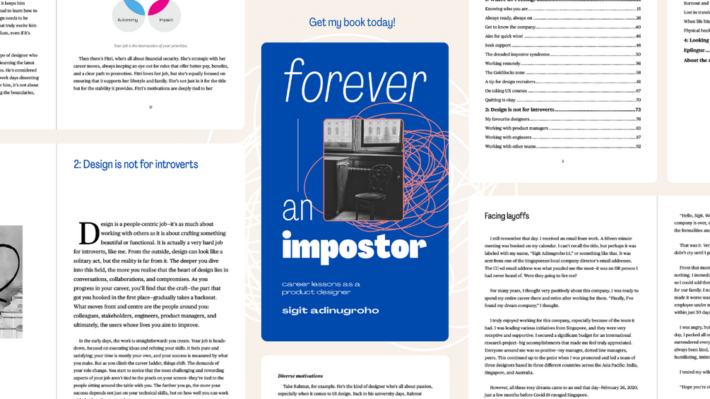 “Forever an Impostor” is a candid collection of thoughts (and feelings) by Sigit Adinugroho, a product designer navigating the highs and lows of the design world while grappling with self-doubt, impostor syndrome, and the realities of balancing career and family. Blending personal anecdotes, professional insights, and practical advice, this book offers a heartfelt reflection on the unglamorous side of the design profession—where resilience, adaptability, and self-acceptance become key to thriving. Whether you’re an aspiring designer or a seasoned professional, Sigit’s journey provides an authentic look into the often messy yet rewarding path of a creative career.